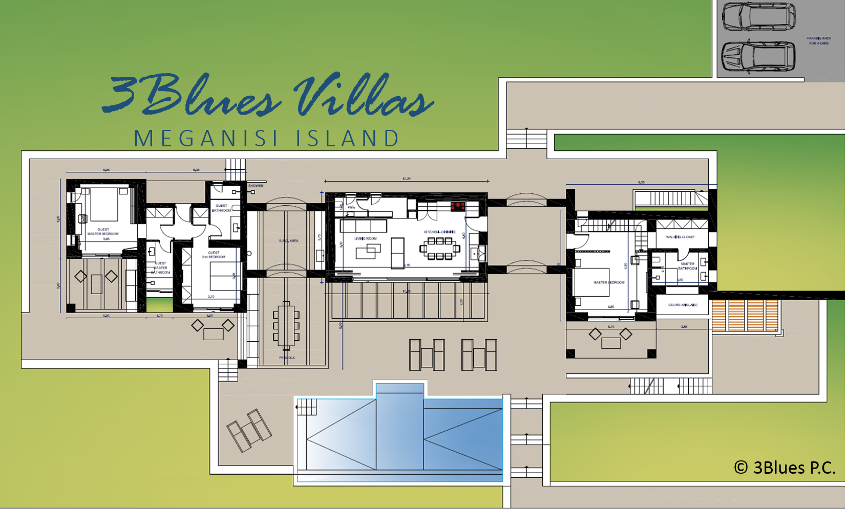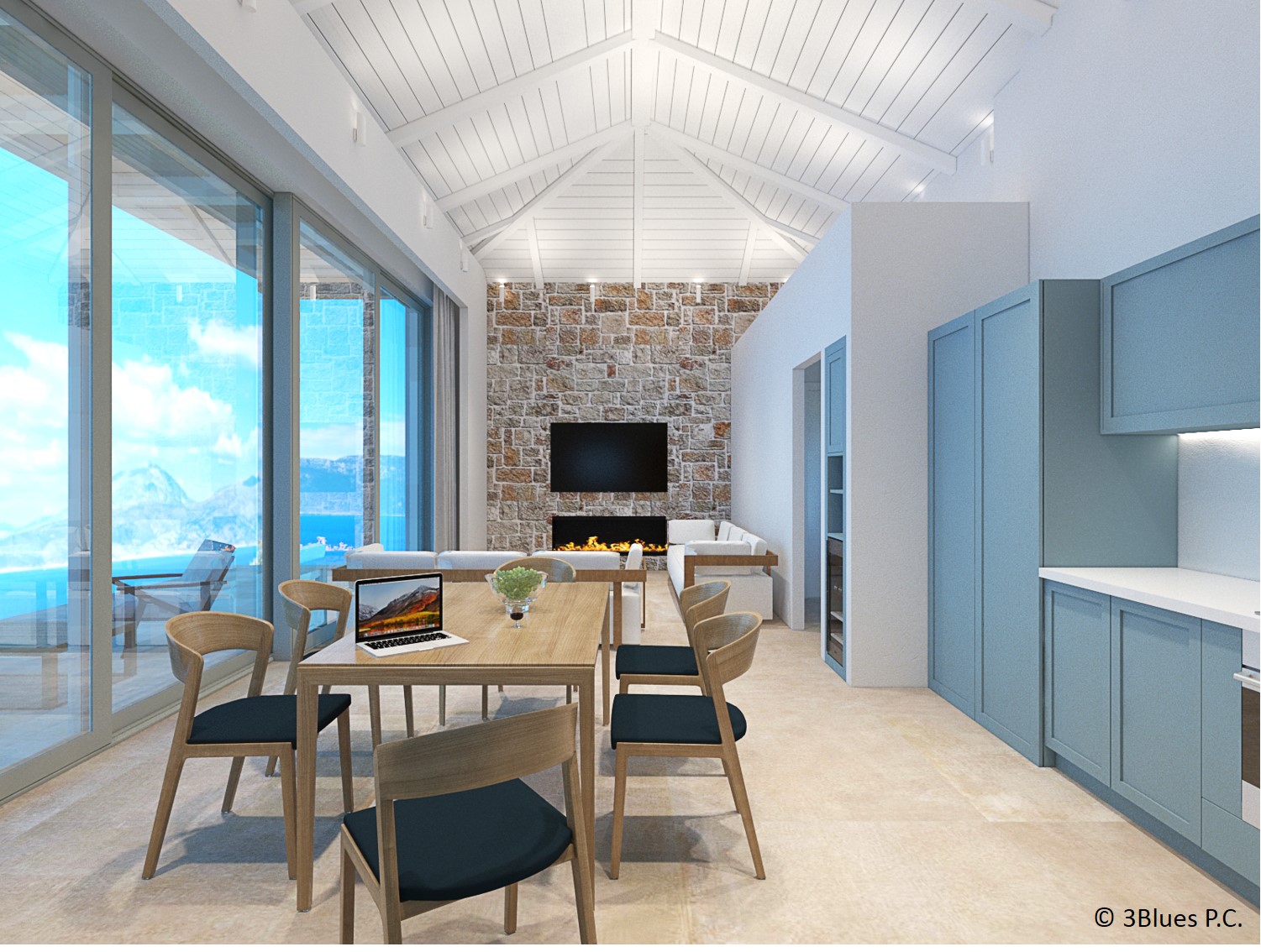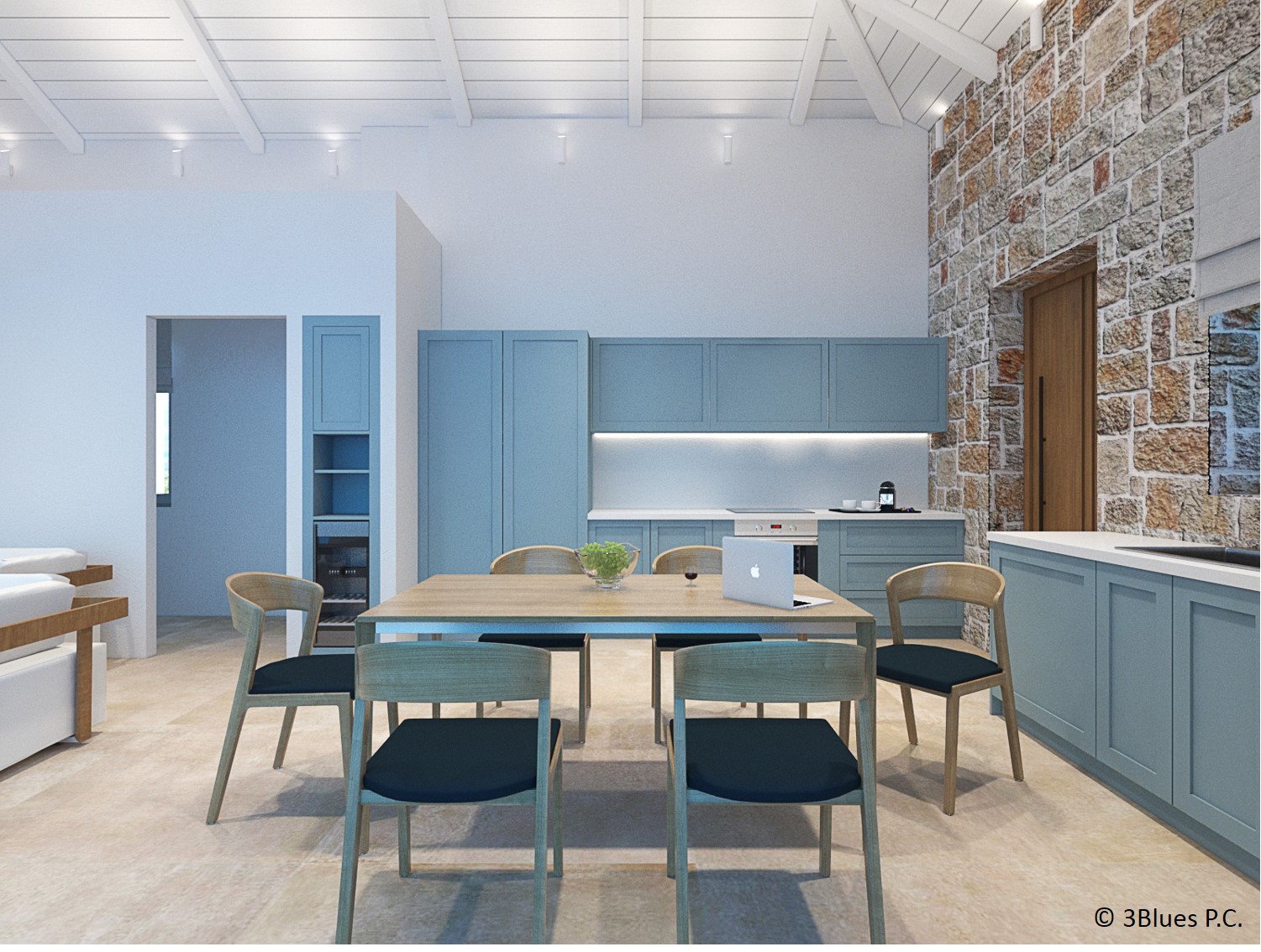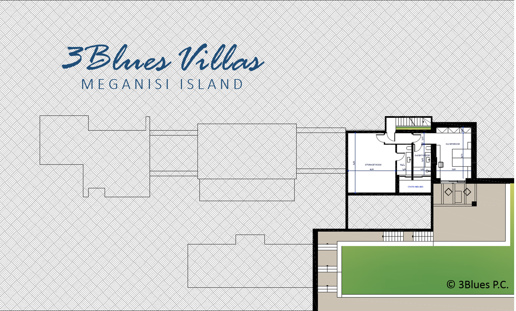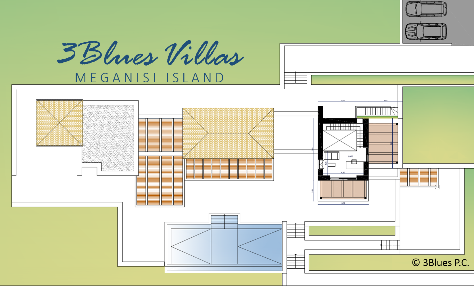 Villa Synthesis is only a few meters away from the seafront. This sprawling villa consists of 4 building structures and an outdoor lounge area. The living room and kitchen along with a guest WC are located in the central building. To the west side of that, there is a building complex with private entrance that consists of two bedrooms that can accommodate up to 4 guests. One of those bedrooms has a double bed and the other has two single beds. To the east side of the central building there is a complex of a 2-story and a ground level building with a total of 2 bedrooms and a loft. This complex can accommodate up to 6 guests in total. The 2-story building has its own private entrance and includes a bedroom with a double bed and a loft that can function as an office or accommodate two single beds. The ground level building consists of a bedroom with a double bed and it also has its own private entrance. In addition, there is a spacious basement that can offer extra space if needed.